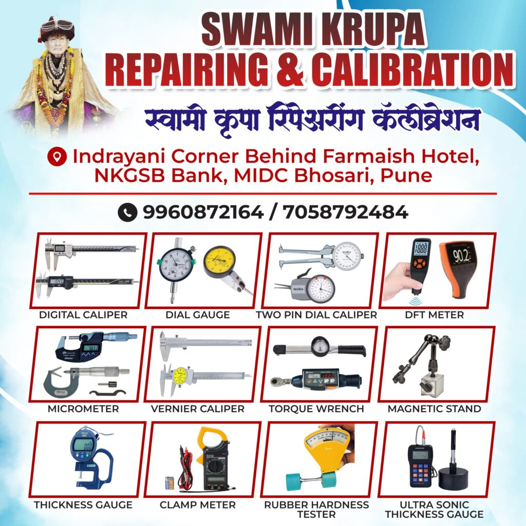 Swami Krupa Repairing & Calibration is a trusted service provider located in Bhosari, Pune, specializing in the repair measuring Instruments and NABL calibration of mechanical / Eletrical / Thermal , Pressure and digital measuring instruments. With years of hands-on experience, we cater to industries, workshops, and individual professionals who rely on precision tools for their work. Our services cover a wide range of instruments including Vernier Calipers, Digital Vernier Calipers, Plunger Dial Gauges, Lever Dial Gauges, Two-Pin Dial Gauges, Digital Height Gauges, DFT Meters, Ultrasonic Thickness Gauges, Multimeters, and Clamp Meters, Pressure Gauge, Vaccum Gauge , Torque wrenches Special Cheaking Instruments , Mitutoyo Instruments , Baker Insruments , Insize Instruents , Etc We are committed to delivering accurate, reliable, and prompt solutions, ensuring that every instrument meets standard measurement accuracy. Our calibration process follows professional guidelines, helping clients maintain quality control and compliance. We also provide NABL-certified calibration services through trusted partners. Located at J Block, Indrayani Corner, back side of Farmaish Hotel / Rathod Canteen Hotel,Above Kalpna Enterprises 2nd Floor , Bhosari , Pune 026 our facility is equipped to handle both small and bulk instrument servicing. With a customer-first approach, we aim to provide affordable pricing without compromising on quality. For quick assistance, reach us via WhatsApp/ Call : 9960872164 And Call: 7058792484 . At Swami Krupa, precision is our promise, and your satisfaction is our priority.